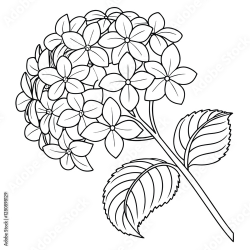 Hydrangea Flower Line Art: Detailed Black and White Illustration of Blooming Hydrangea with Leaves, Botanical Drawing for Coloring Pages