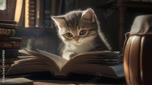 Hyper realistic clipart cute kitty reading a book