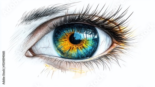 Hyper-detailed, realistic human eye with colorful iris and visible veins, isolated on a white background for emphasis.