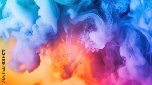 Hyper-Realistic Close-up of Colorful Smoke and Ink in Water, Purple and Orange Palette on Blue Background, Delicate Lines