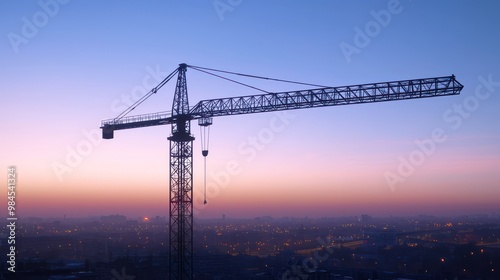 Hyper-realistic depiction of a large construction crane towering over an urban landscape at dusk