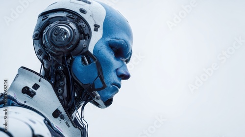Hyper-realistic futuristic humanoid character with detailed cybernetic features, space for text