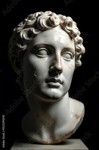 Hyperrealistic Photograph of Damaged Greek Marble Statue – Classical Sculpture with Smoothed Facial Erosion Against Black Background – High-Contrast Lighting Emphasizing Stone Texture & Gritty Patina