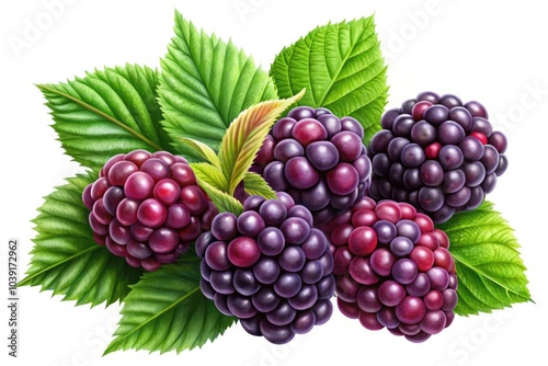 Hyperrealistic ripe blackberries on a branch, showcasing vivid details and vibrant colors, ideal for culinary creations and nature-themed designs with a transparent background.