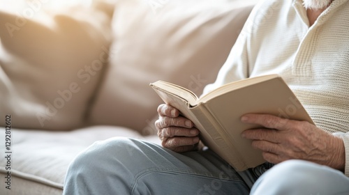 Hypertension patient relaxing with a book on a comfy sofa. Featuring self-care and stress relief