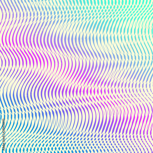 Hypnotic iridescent holographic texture with moire effect. Trendy colorful background in light neon design. For your creative project design cover, book, package, printing, gift card, fashion.