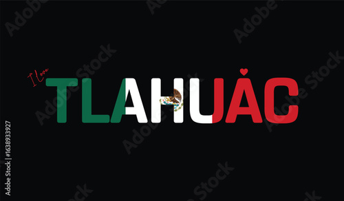 I Love Tlahuac, Typographic Design of I Love Tlahuac on a black background, Flag Typography of Tlahuac with heart, Vector design of I Love Mexico
