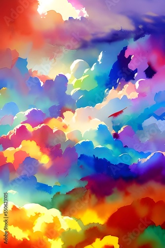 I see a beautiful watercolor painting of colorful clouds. The artist has used light and dark colors to create depth and interest. I can imagine the clouds billowing in the sky, changing shape as they