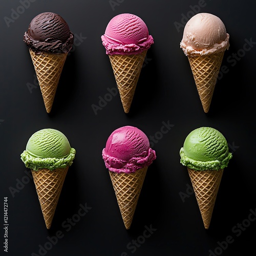 ice cream coins in right green, red, pink, puple Colorful ice cream cones in various flavors.