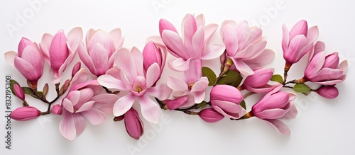 Ice cream cone with spring pink magnolia flowers composition on white background Minimal spring concept Flat lay top view. Creative banner. Copyspace image