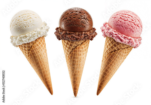 Ice cream cones display different flavors like chocolate vanilla and strawberry against a white backdrop