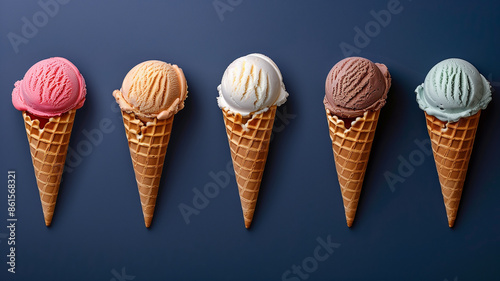 Ice cream cones with various colors and flavors are arranged in a row on a dark background. Perfect symmetrical summer, ice cream advertisement.