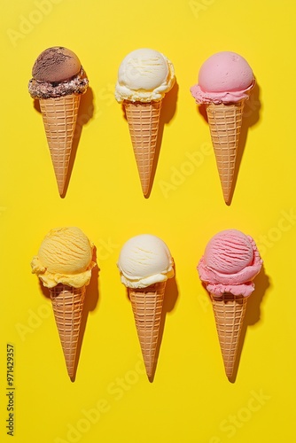 Ice cream cones with various flavors on a yellow background