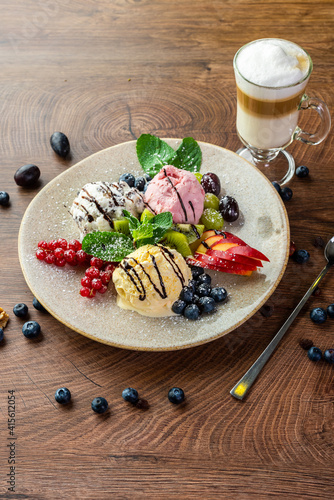 Ice cream dessert. Three multi-colored balls of ice cream, decorated with fruits, berries and mint, on a large plate