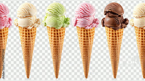 Ice cream scoop on waffle cone on transparent background cutout, PNG file. Many assorted different flavour Mockup template for artwork design
