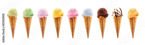 Ice cream scoop on waffle cone on transparent background cutout, PNG file. Many assorted different flavour Mockup template for artwork design.