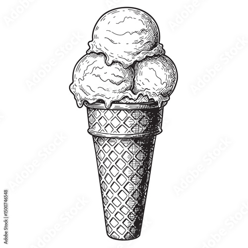 Ice Cream Scoops on a Cone Doodle Illustration – Hand-Drawn Black and White Line Art on Transparent Background