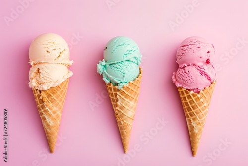Ice cream with vanilla and strawberry flavors on a pink background. Copy space. AI created.