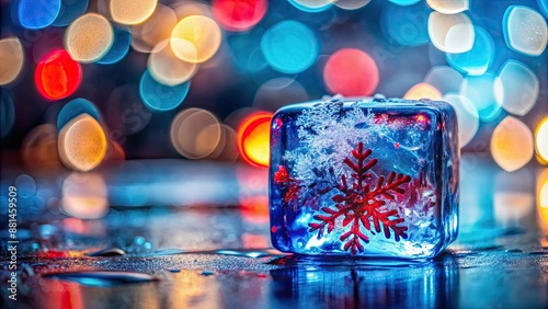 Ice cube covered in winter-themed red and blue colors with blurred bokeh background, ice cube, winter, red, blue, bokeh