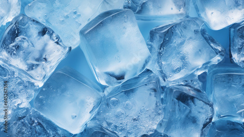 Ice cubes bluish background. Frozen water. Cold fresh concept. Generative AI