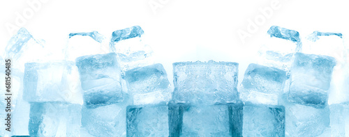 Ice cubes isolated white background,Realistic frozen ice cubes and water wave splashes, kitchen skinali panel background. Ice cubes whirl in liquid blue clear aqua wave, splatters of clean drink swirl
