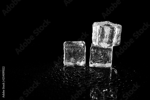 ice cubes reflection on black table background.