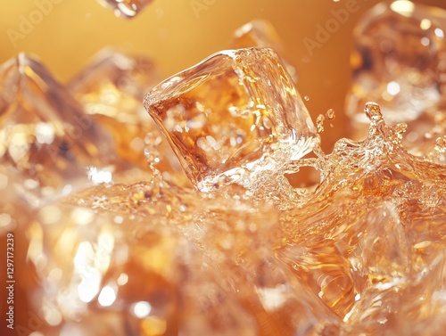 Ice Cubes Splashing in Golden Liquid Creating Refreshing Bubbles