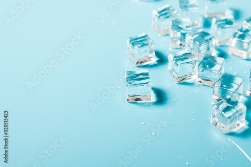 Ice cubes with water on a blue background. Ice concept for drinks. Banner. Flat lay, top view