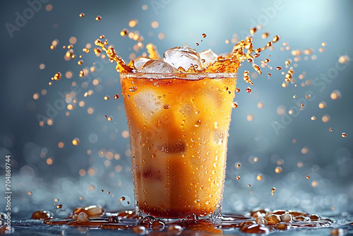 Iced coffee in a glass on a blue blurred background close-up.