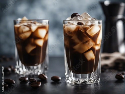 Iced coffee in a tall glass with cream poured over it, ice cubes and coffee beans are on the dark marble table