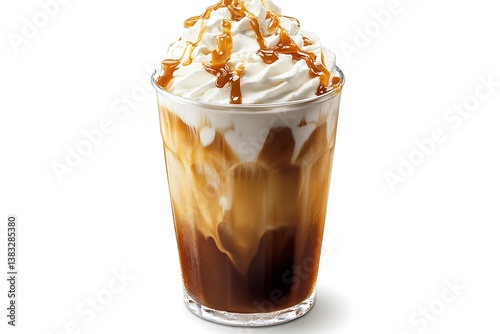 Iced Coffee with Whipped Cream and Caramel Drizzle in Clear Cup with Straw for Dessert Beverage Ads and Menus