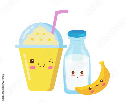 Iced Fruits & Vegetables Smoothie in a plastic cup with rich foam. Vector kawaii drink illustration in cute cartoon style isolated on white background. Banana with milk in glass healthy smoothie.