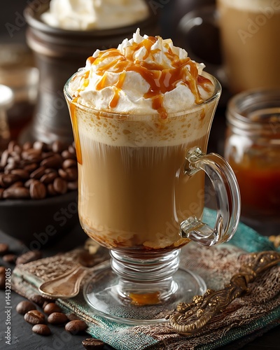 Iced latte with whipped cream and caramel drizzle, with scattered coffee beans, on patterned cloth