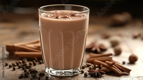 Iced Masala Chai with spices on wooden table.