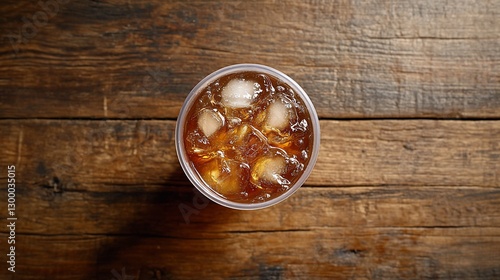Iced tea in a plastic cup with ice cubes on a wooden table, top view.