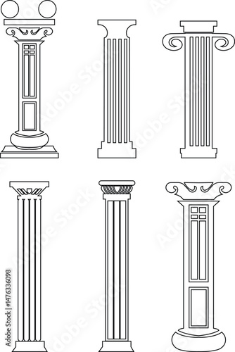 icon set of classical building with columns representing ancient architecture, linear style icon. historic designs. Editable stroke width symbols elements infographics for web transparent background