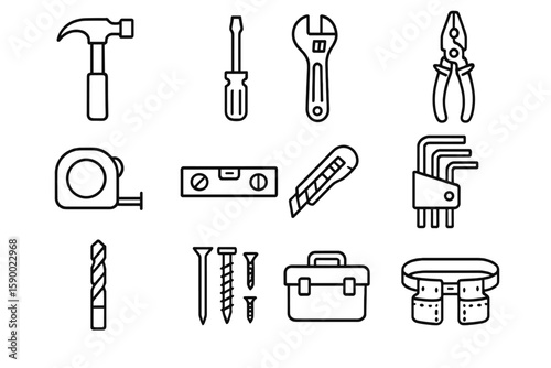 Icon set of hand tools on dark background: hammer, screwdriver, wrench, pliers
