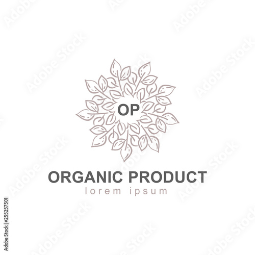 Icon Vector hand sketched logotype, leaf label template for vegan food package design. wreath, doodle, round frame. Isolated leaves icon. bio nutrition, healthy diet, vegan restaurant menu