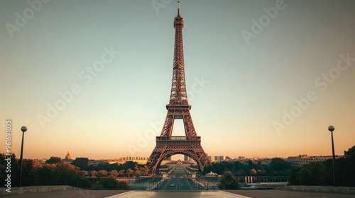 Iconic Eiffel Tower in Paris, France, with a clear, empty foreground, showcasing the landmark against a serene sky