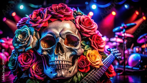 Iconic rock band logo design featuring a skull with roses and a vibrant color scheme on display