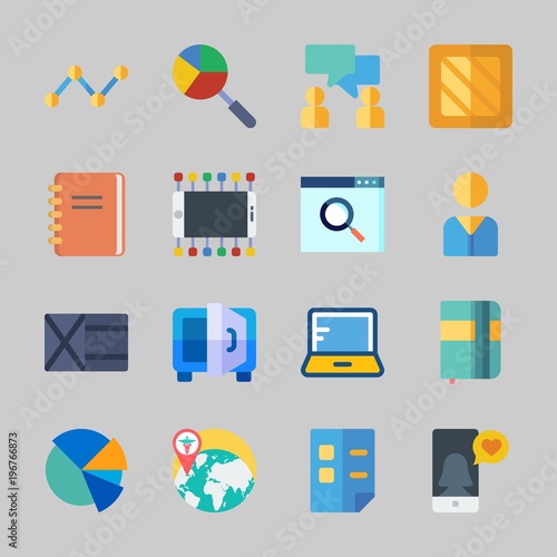 Icons about Business with user, pie chart, line graph, conversation, smartphone and search