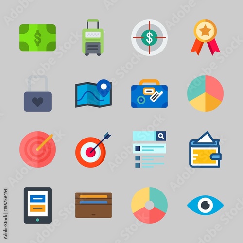 Icons about Commerce with target, pie chart, padlock, tablet, suitcase and search