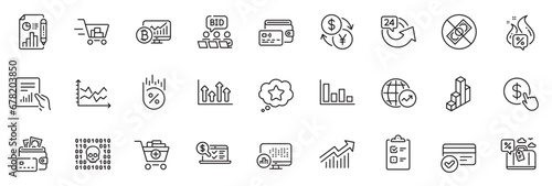 Icons pack as Demand curve, 3d chart and Add products line icons for app include Hot offer, Wallet, Upper arrows outline thin icon web set. Diagram chart, Travel loan, Document pictogram. Vector