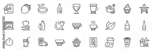 Icons pack as Food app, Acorn and Frying pan line icons for app include Night eat, Whiskey bottle, Latte outline thin icon web set. Bombon coffee, Cake, Food delivery pictogram. Vector
