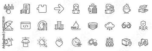 Icons pack as Group people, Heart and Security agency line icons for app include Cloud computing, Correct checkbox, Freezing timer outline thin icon web set. Parcel tracking, Bell. Vector