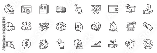 Icons pack as Project deadline, Fast delivery and Confirmed flight line icons for app include Buildings, Vip timer, Check investment outline thin icon web set. Cursor, Cv documents. Vector