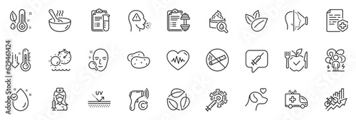 Icons pack as Thermometer, Vaccine message and Pets care line icons for app include Tanning time, Training results, Vaccination outline thin icon web set. Vitamin e, Dumbbell, Cook pictogram. Vector