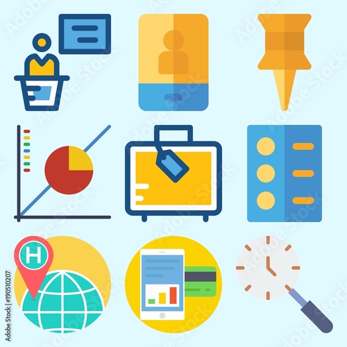 Icons set about Business with worldwide, push pin, smartphone, suitcase, presentation and search