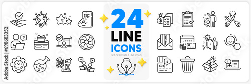 Icons set of Employee, Loyalty card and Creative idea line icons pack for app with Credit card, Online question, Online voting thin outline icon. Money calendar, Approved checklist. Vector