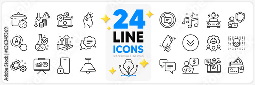 Icons set of Stop talking, Car charging and Music line icons pack for app with Dots message, Ceiling lamp, Engineering team thin outline icon. Cyber attack, Presentation. Design with 3d stars. Vector